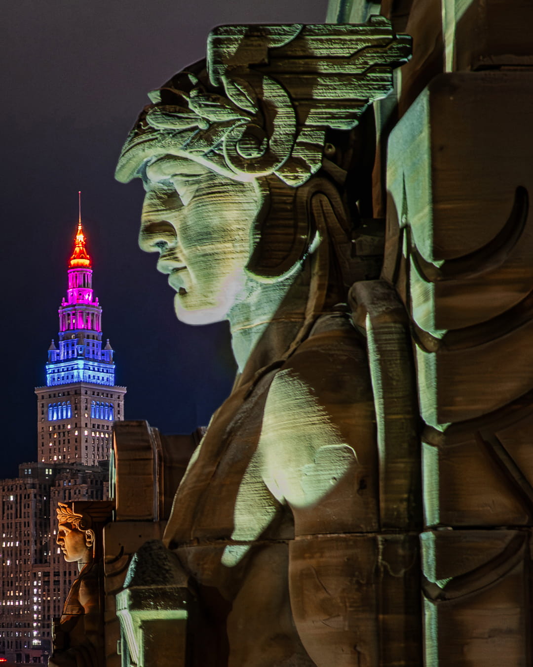 Cleveland’s stone guardians stand watch over the city. These silent sentinels frame an iconic view, where historic architecture meets the vibrant, color-lit presence of the Terminal Tower. There’s something timeless in the contrast between the intricate carvings and the electric glow of the cityscape, a reminder that even in a city constantly evolving, some figures remain to quietly watch over it all.